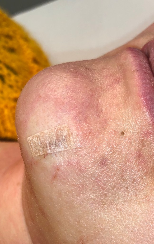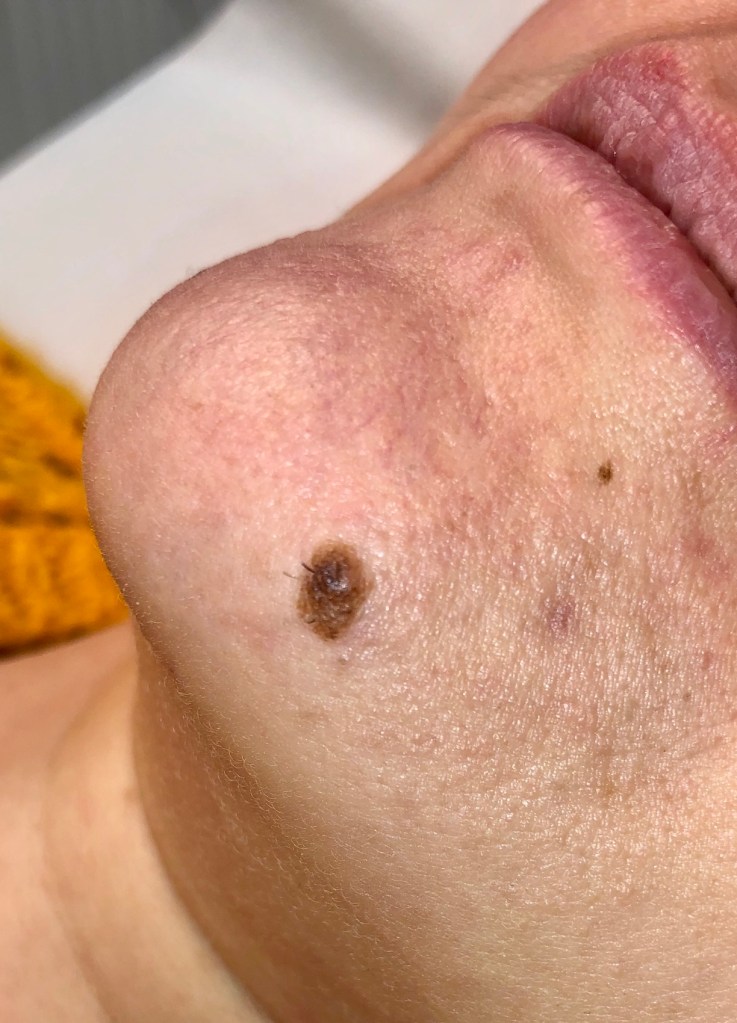 Toinen luomi oli tummapigmenttinen karvaa kasvattava luomi leuassa. Jotta varmuudella saisimme karvajuuret ja pigmentin pois, luomi poistettiin pienesti kirurgisesti.