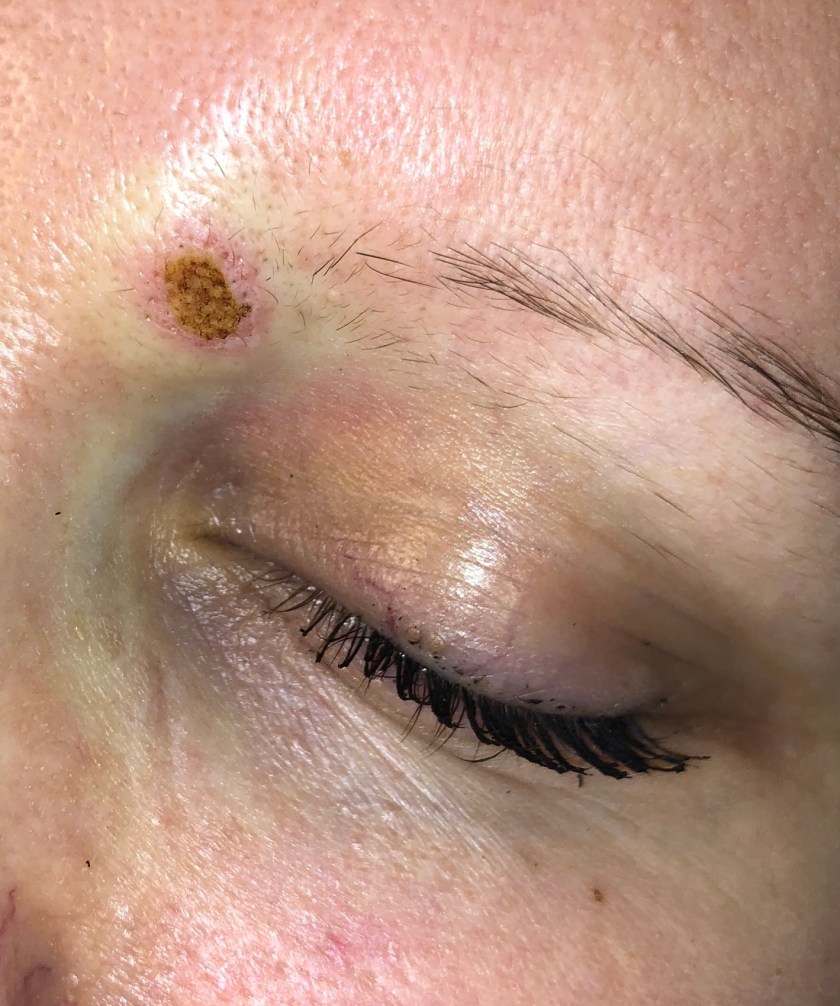 Toinen asiakas halusi kahdesta häiritsevästä kasvojen luomista eroon. Kulmakarvan luomi oli koholla, ilman pigmenttiä ja dermatoskoopilla hyvänlaatuiseen intradermaaliseen neevukseen sopiva, joten se hiottiin ympäröivän ihon pintaan CO2 laserilla.