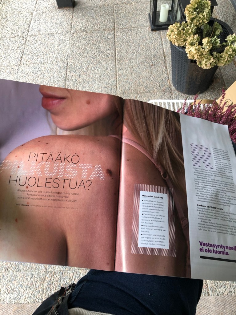 Toinen luomi oli tummapigmenttinen karvaa kasvattava luomi leuassa. Jotta varmuudella saisimme karvajuuret ja pigmentin pois, luomi poistettiin pienesti kirurgisesti.