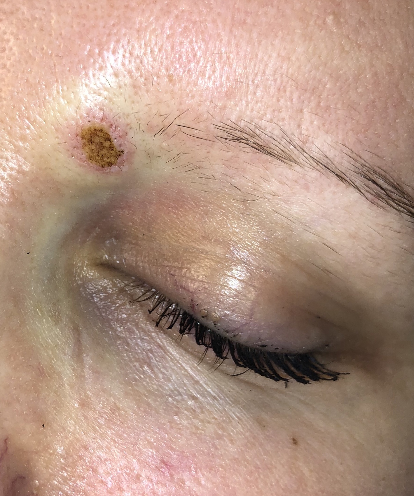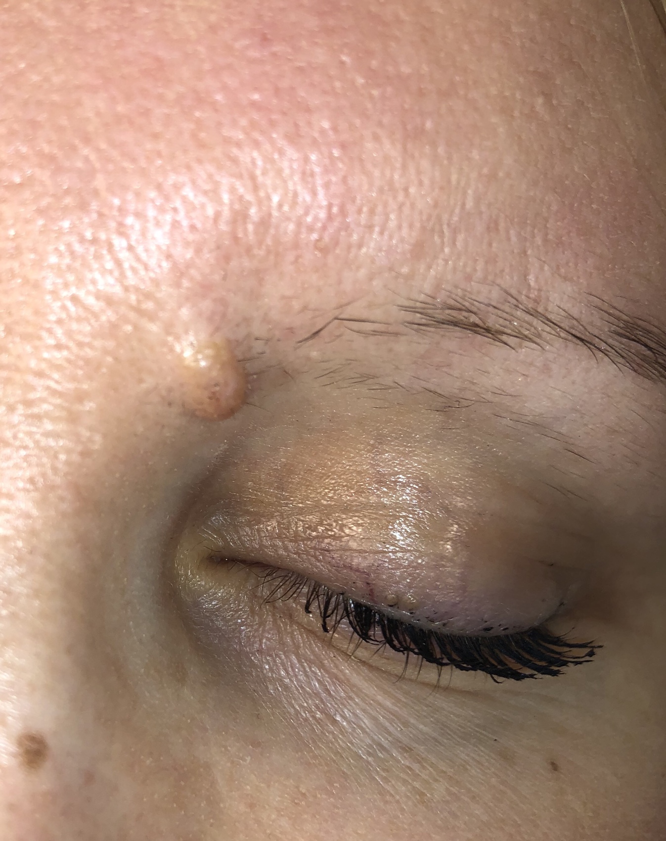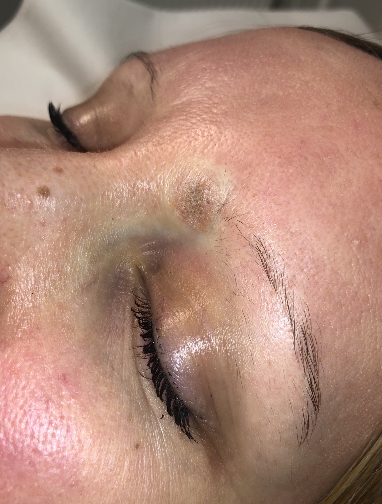 Toinen asiakas halusi kahdesta häiritsevästä kasvojen luomista eroon. Kulmakarvan luomi oli koholla, ilman pigmenttiä ja dermatoskoopilla hyvänlaatuiseen intradermaaliseen neevukseen sopiva, joten se hiottiin ympäröivän ihon pintaan CO2 laserilla.
