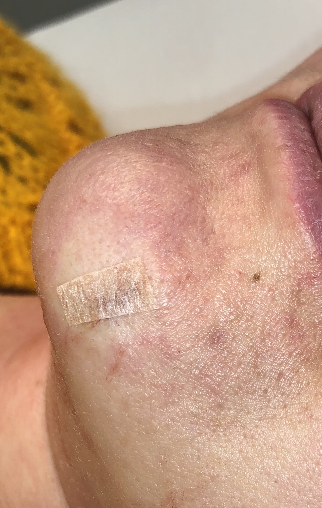 Toinen luomi oli tummapigmenttinen karvaa kasvattava luomi leuassa. Jotta varmuudella saisimme karvajuuret ja pigmentin pois, luomi poistettiin pienesti kirurgisesti.